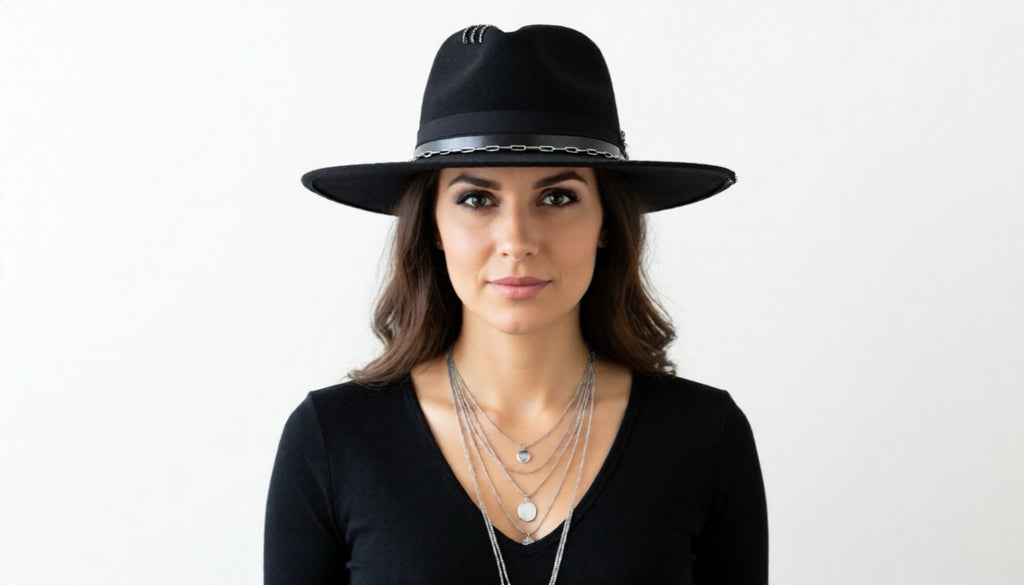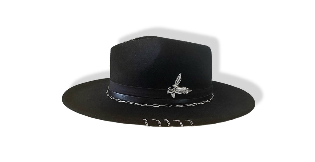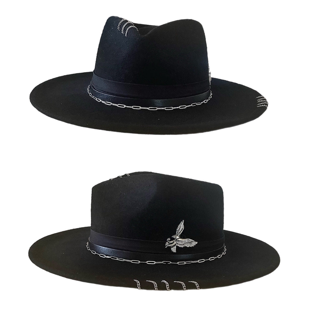Ce chapeau noir profond est sublimé par une fine chaîne argentée et un emblème d’aigle, symbole de liberté et de puissance. Chaque détail raconte une histoire de maîtrise et de style.