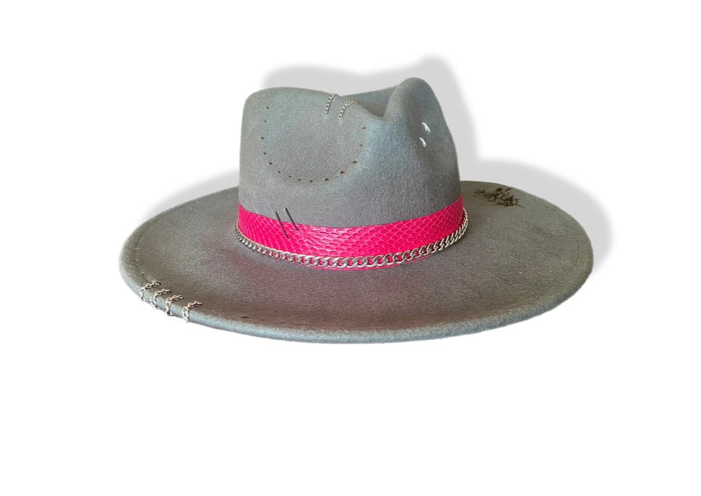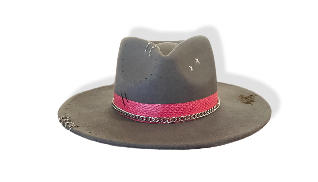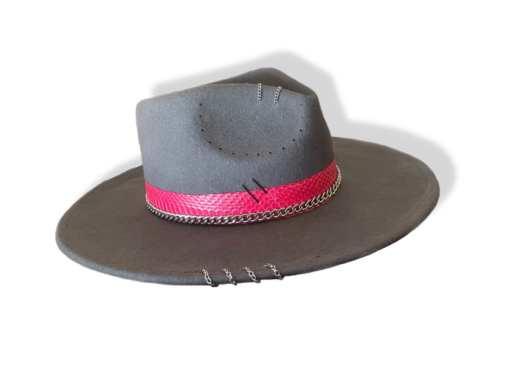 Une bande en serpent rose intense, cerclé d’une chaîne argentée, vient rompre la sobriété avec passion.
