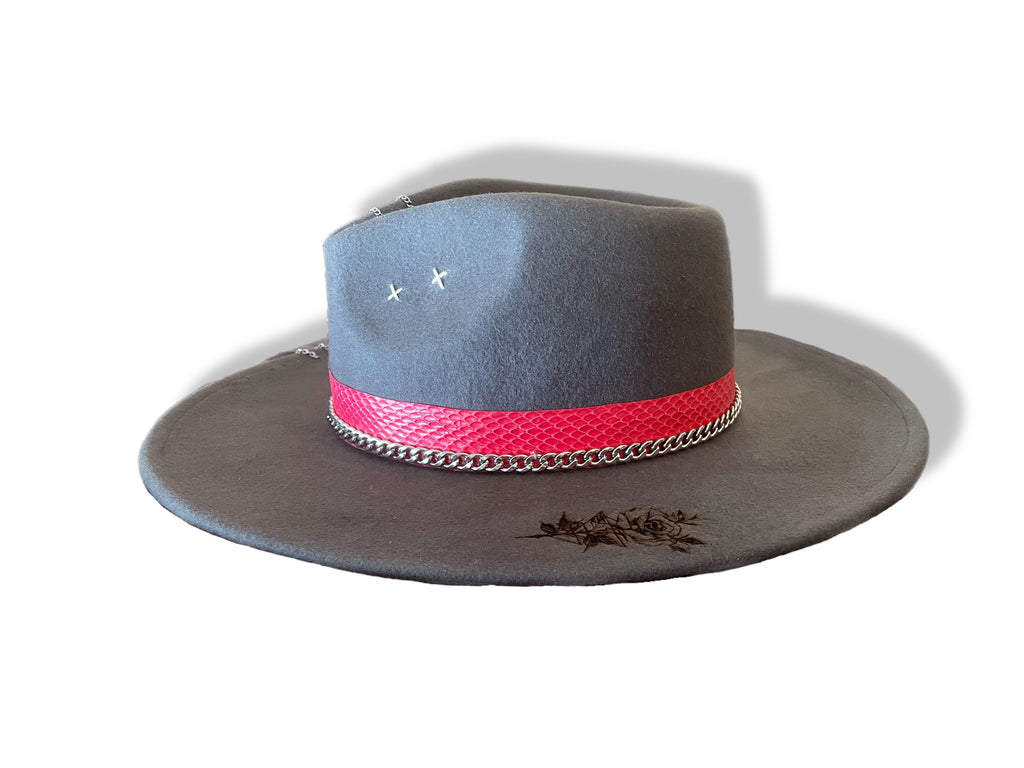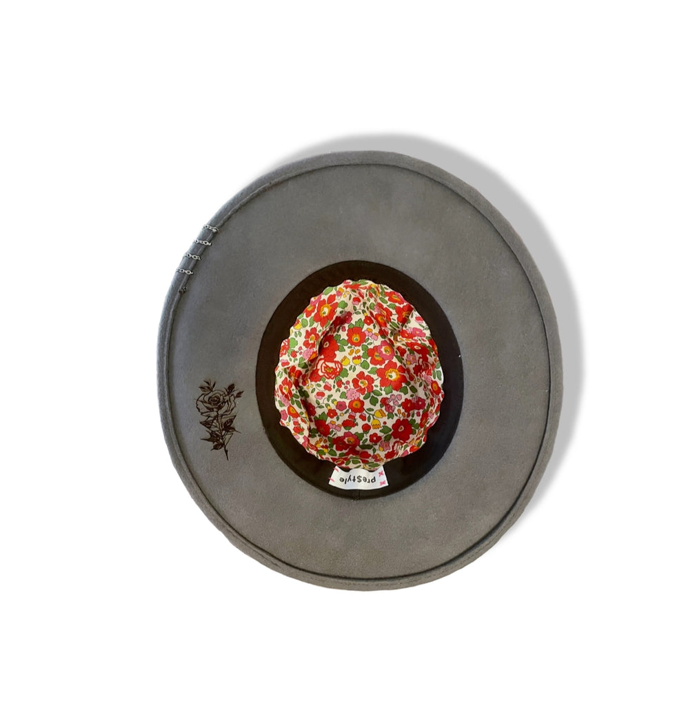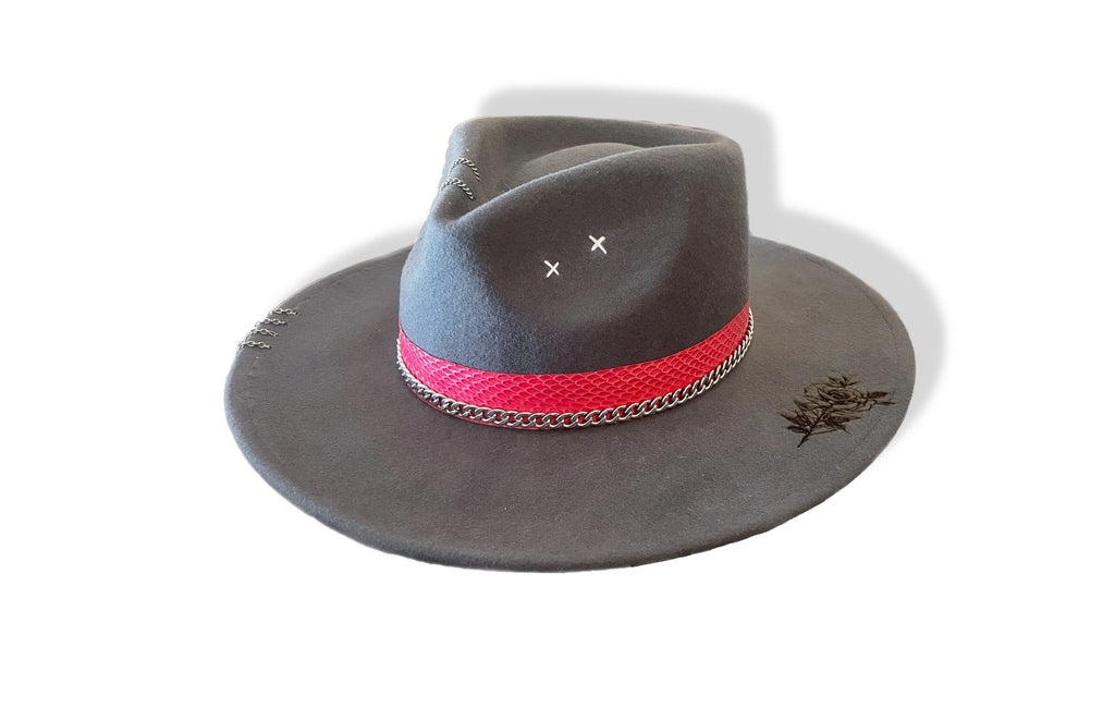 En feutre gris, il associe la douceur du ton neutre à la puissance du détail.