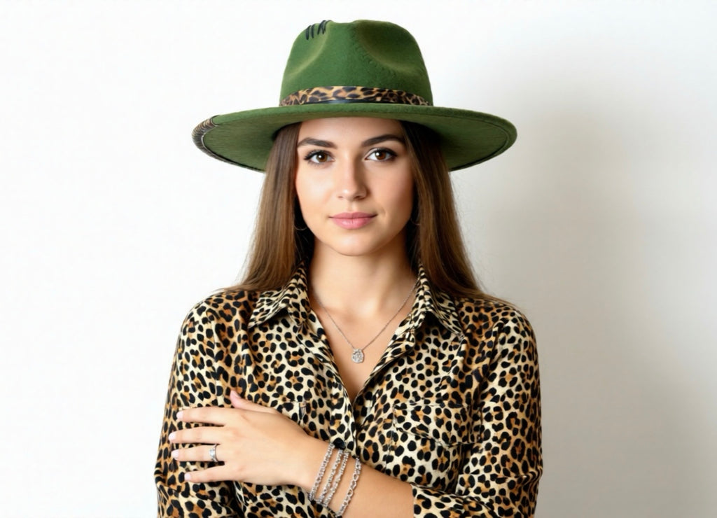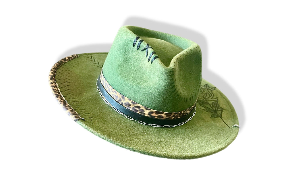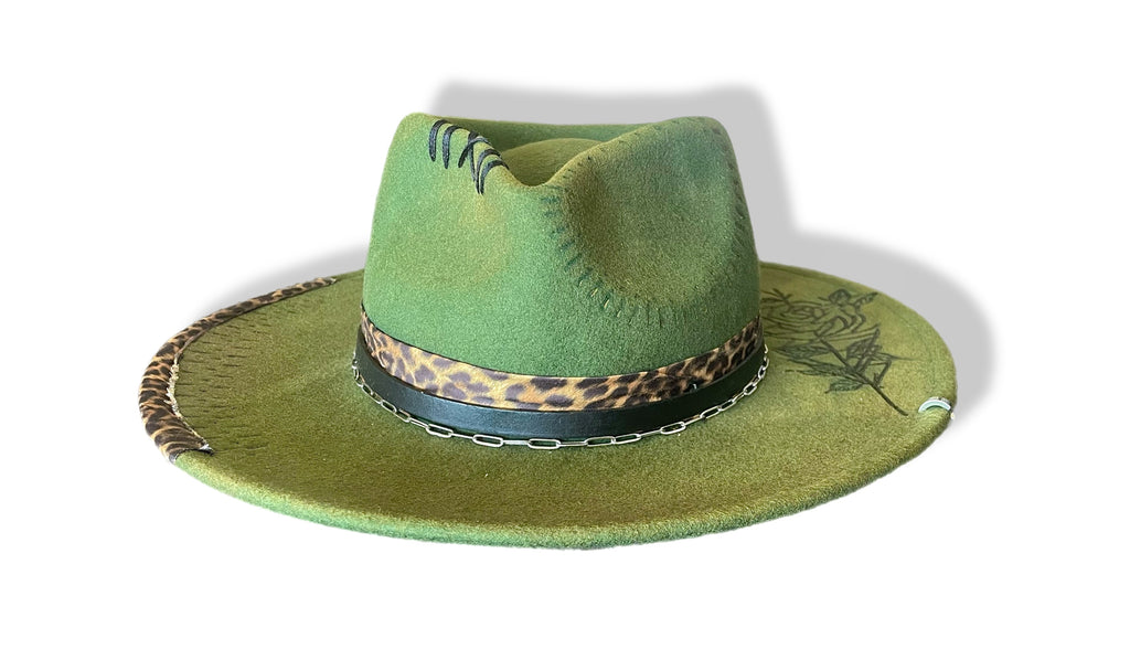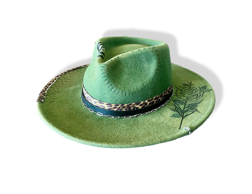 Ce chapeau se distingue par ses gravures de roses et sa bande léopard, subtilement sauvage.