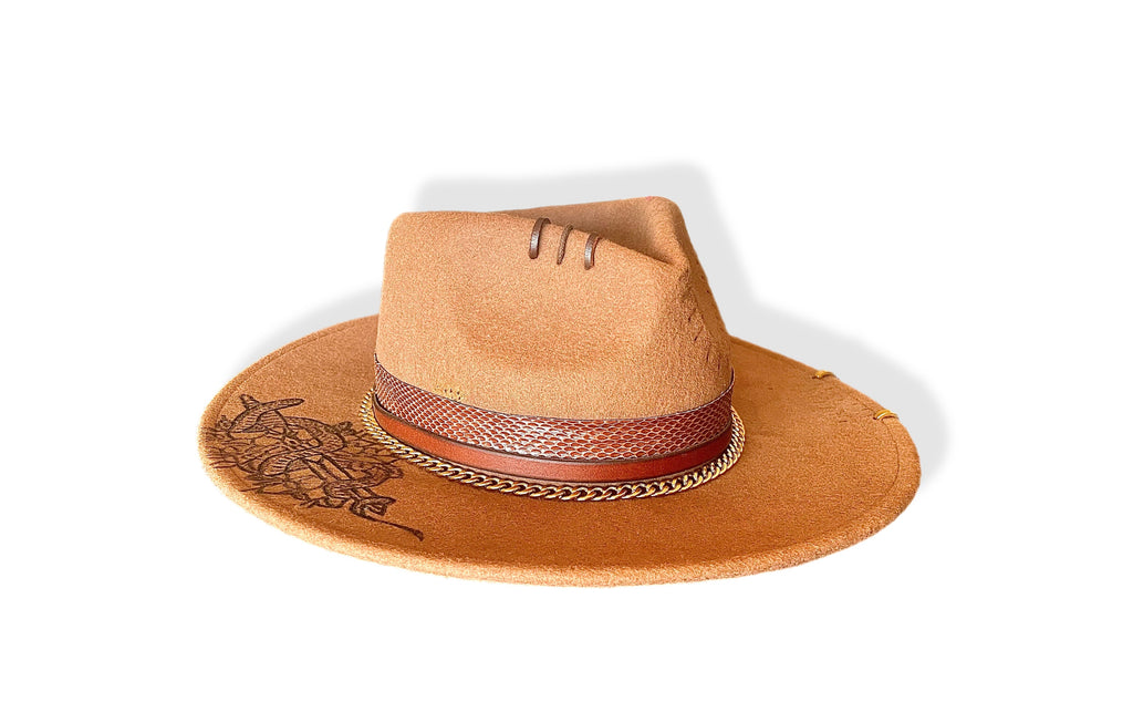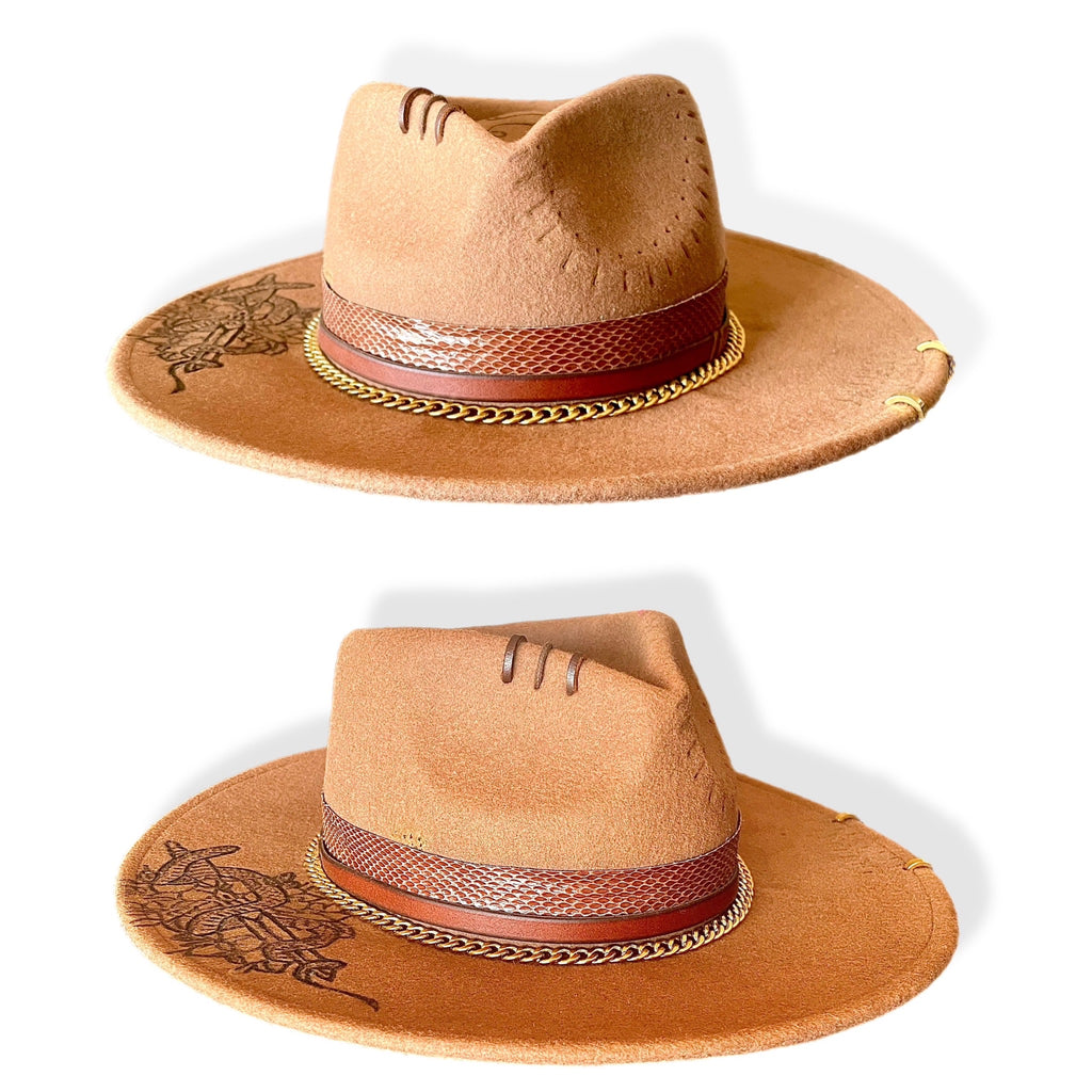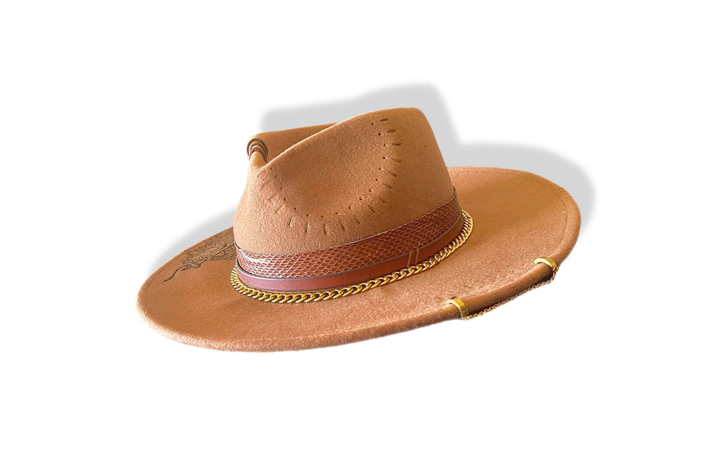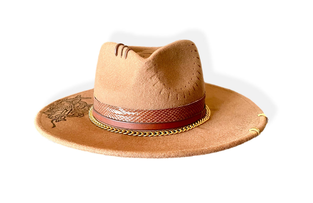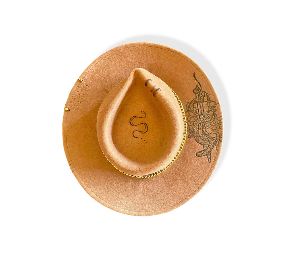 Sa teinte sable doré évoque la chaleur du désert, sublimée par un ruban en serpent et une fine chaîne dorée. Les broderies et motifs gravés apportent une allure royale et intemporelle.