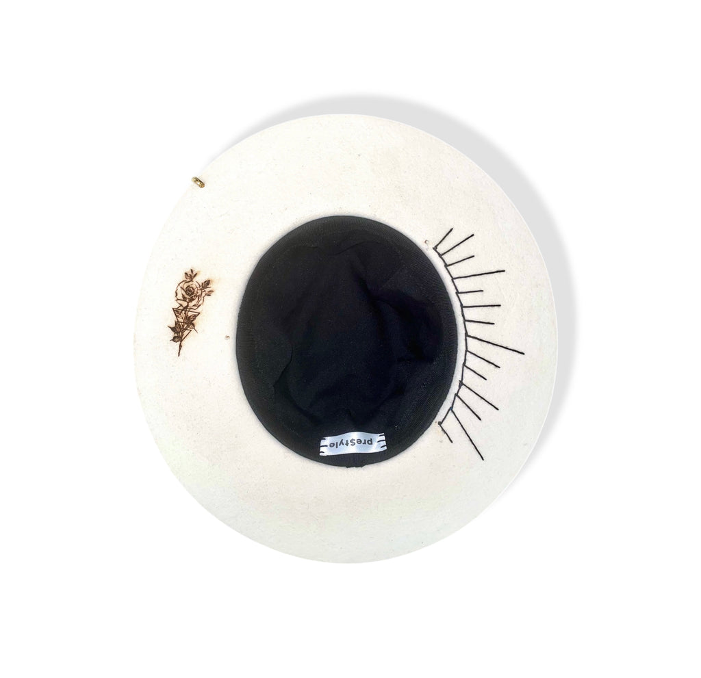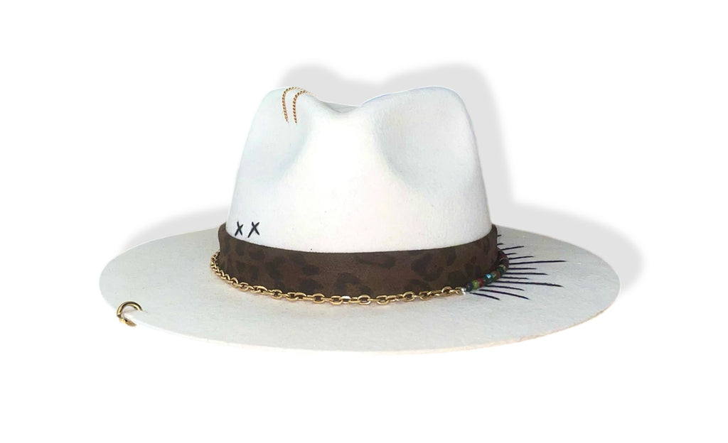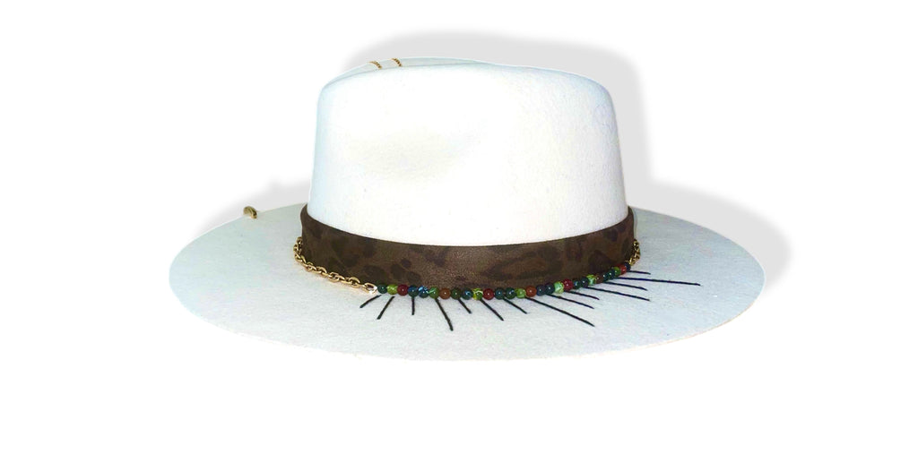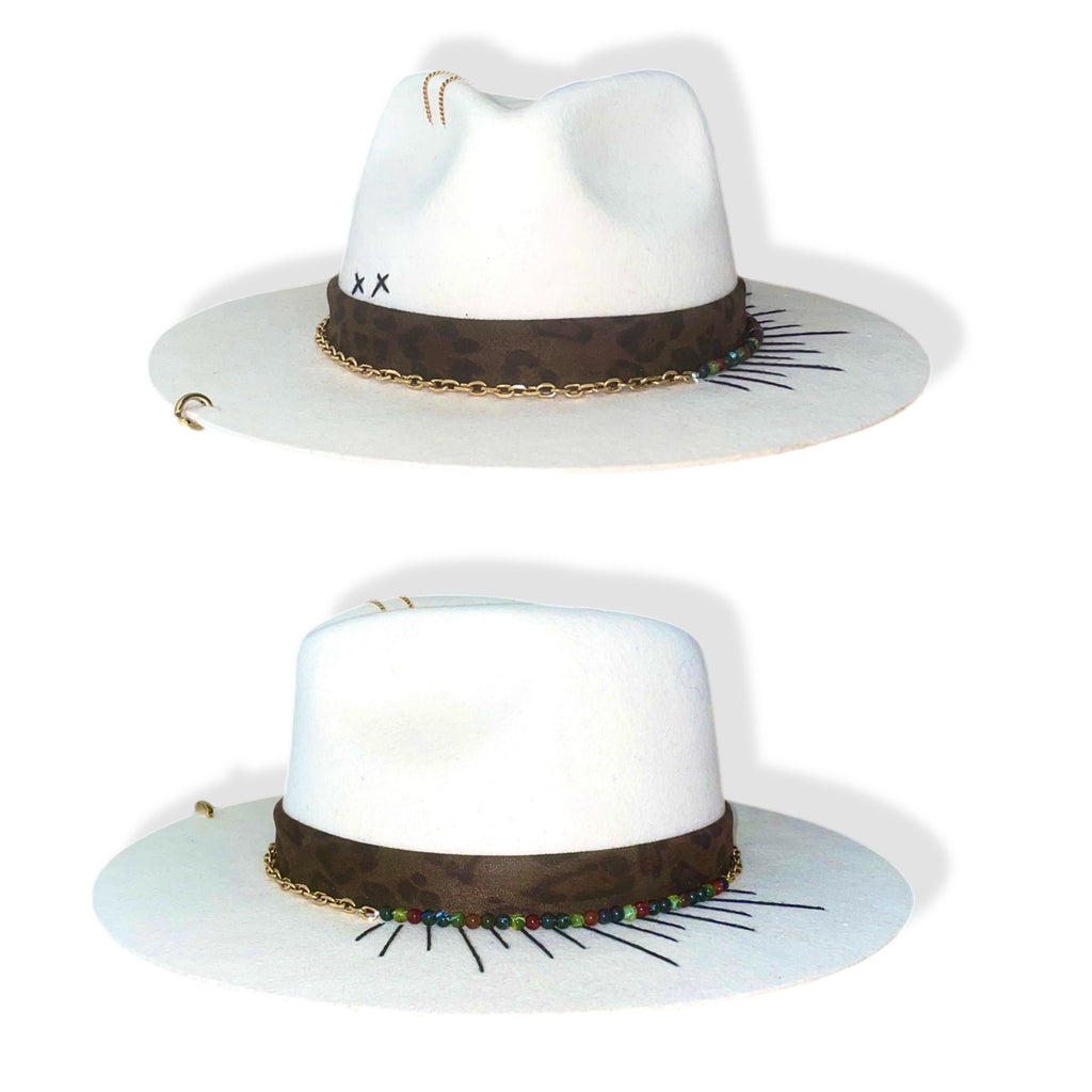 Sous son allure raffinée, il révèle un tempérament audacieux : feutre blanc éclatant, ruban imprimé léopard, chaînette dorée et perles colorées subtilement intégrées. Ce modèle capture la beauté d’un esprit libre et raffiné.
