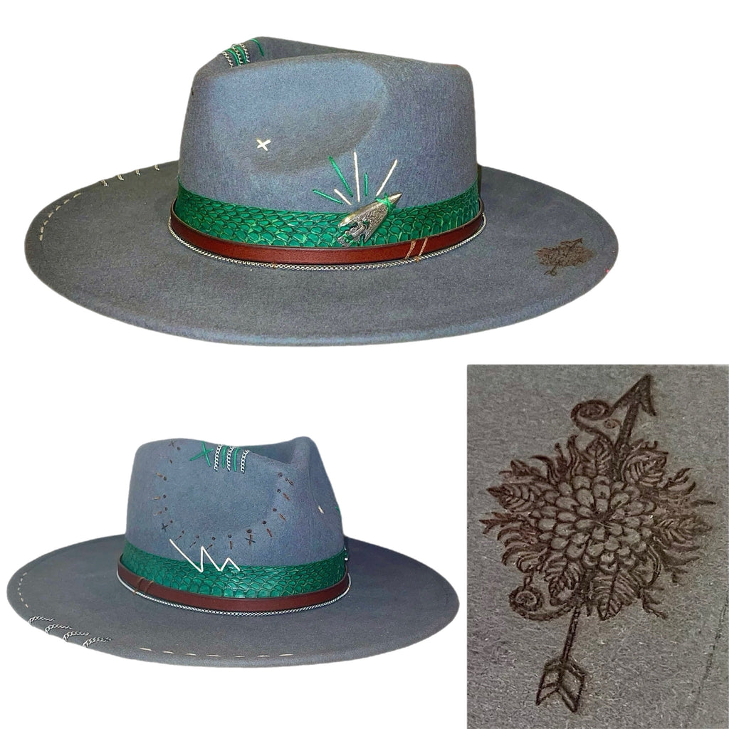 Son feutre gris élégant est sublimé par un ruban vert en serpent et une finition cuir brun, mêlant naturel et sophistication.