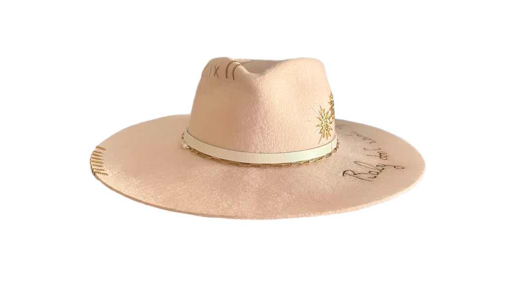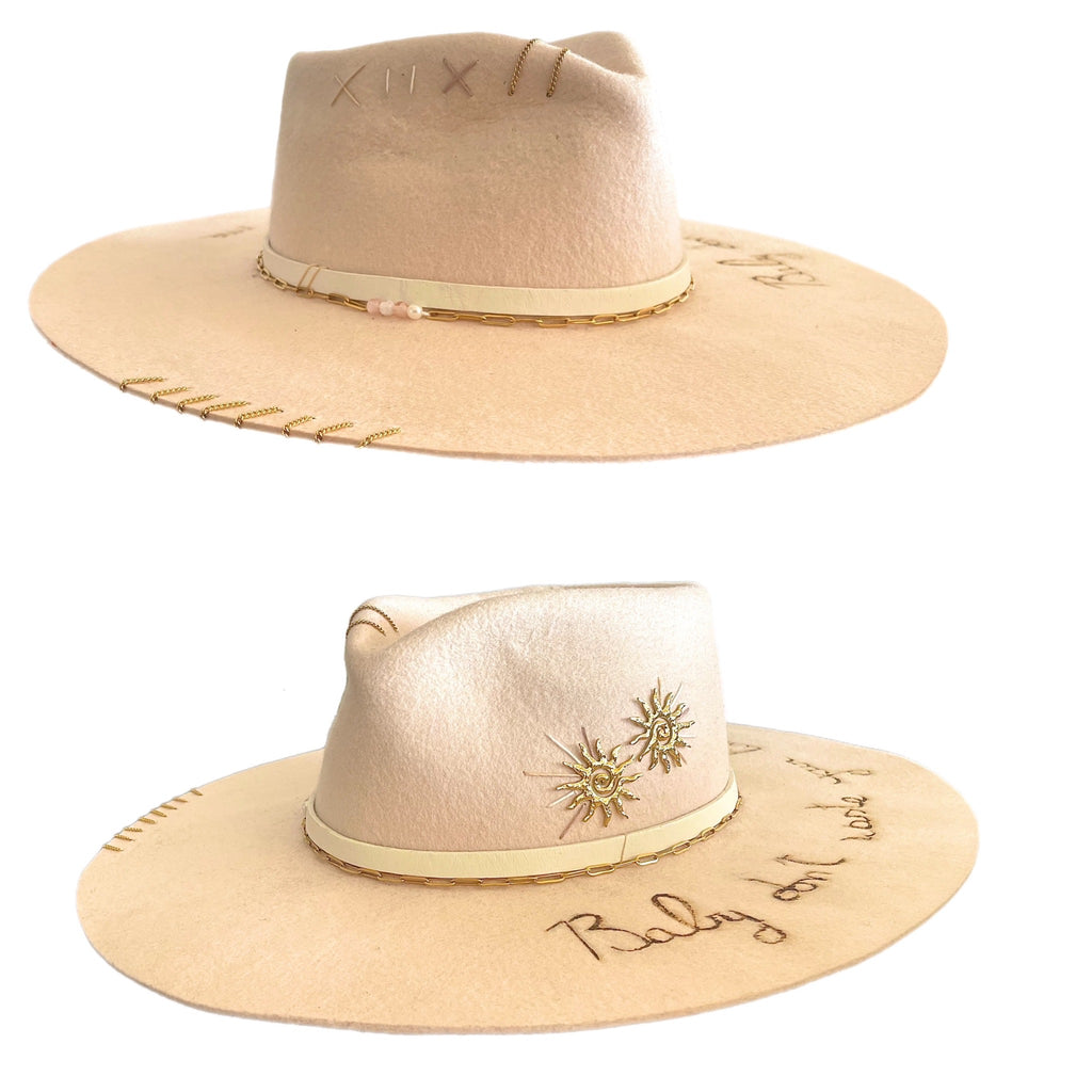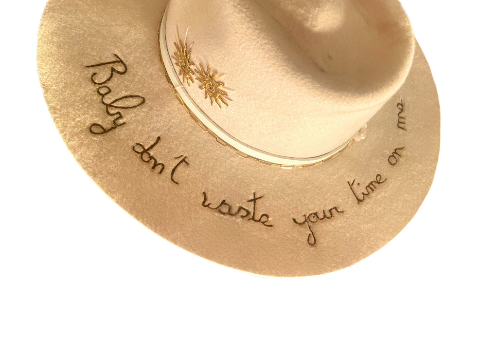 • Inscription gravée à la main :“Baby don’t waste your time on me” et  plusieurs étoiles sous le bord du chapeau pour une signature céleste