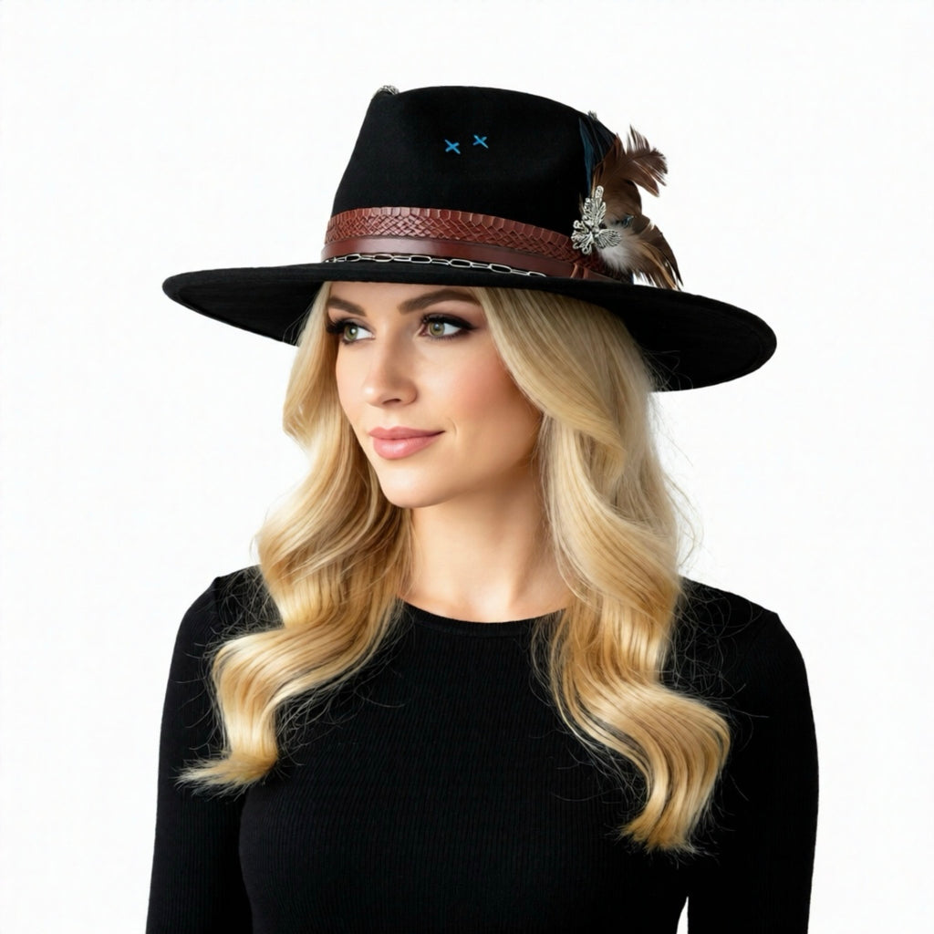 Sa base noire profonde est relevée par des broderies bleu électrique et un ruban en serpent marron, orné d’une plume naturelle. C’est un modèle à la fois audacieux et harmonieux, symbole de l’esprit PRE$TYLE.